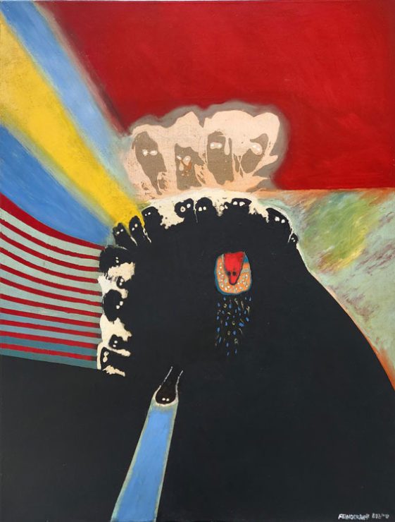 Olio su tela, firmato e datato in latino ed ebraico in basso a dx, titolato, datato e firmato in latino anche sul retro della tela, 116 x 89 cm.