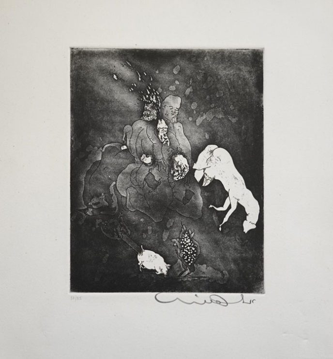 Acquaforte stampata su carta, numerata 33/35 in basso a sx, firmata in basso a dx, 24.3 x 19.7 cm (38 x 35 cm).