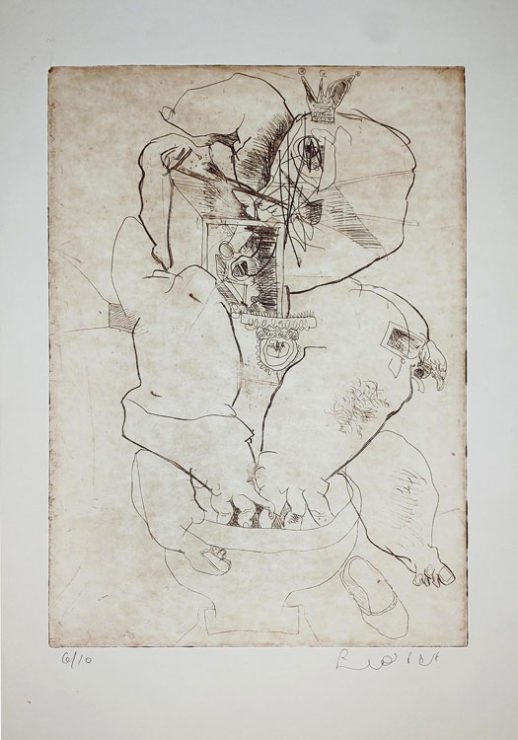 Acquaforte stampata su carta, numerata 6/10 in basso a sx, firmata in basso a dx, 35 x 24.8 cm (50 x 33 cm).