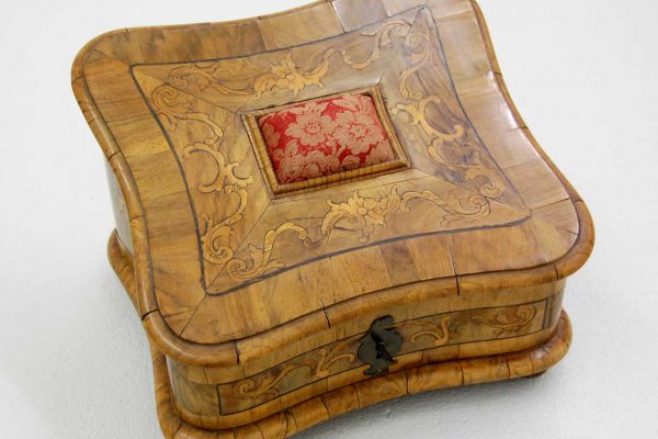 Germania centrale, 1760 ca. Legno di noce, intarsiata e foderata. 26 x 29 x 19.5 (12.5) cm ca. Collezione privata, Svizzera.