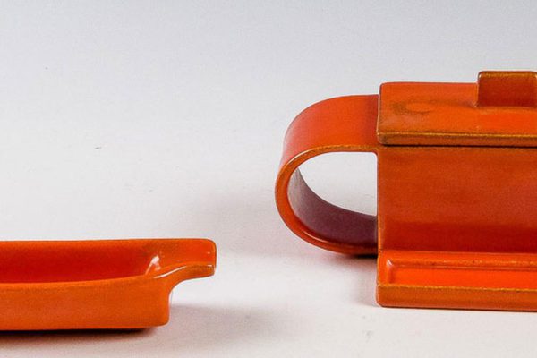 Ceramica di Karlsruhe, scatola per sigarette e posaceneri, ceramicati color arancione, modello disegnato da Paul Speck, n. 2957, h 8 cm (52319). Collezione privata, Svizzera.