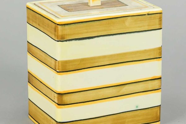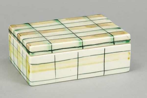 Scatola del tè, Karlsruhe 1920-30. Maiolica di Karlsruhe, disegnata da Paul Speck nel 1927, modello n. 2900, iscrizione Made in Germany, 6 x 14.5 x 9.5 cm. Collezione privata, Svizzera.
