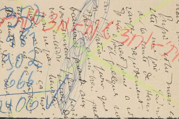 Pastelli, matite e penna su carta stampata, firmato e datato in basso a sx, 11.5 x 20.9 cm. Collezione privata, Svizzera.