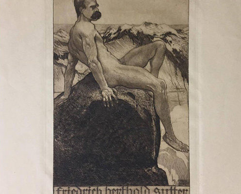 Ex-Libris per Friedrich Berthold Sutter, acquaforte su carta, 16.8 x 10.5 cm (26.6 x 19 cm). Collezione privata, Svizzera.