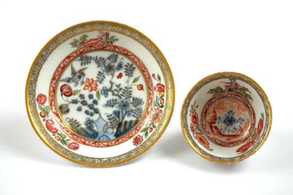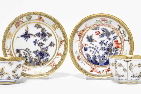 Porcellane Meissen, 1740, dipinte da F. J. Ferner attorno al 1750. Decori est-asiatici blu ceramicato, dipinta a mano, marchio Meissen e firma “W” e “S”, H 4.5 cm e 4.8 cm, Ø 12.5 cm e 13 cm. Collezione privata, Svizzera.