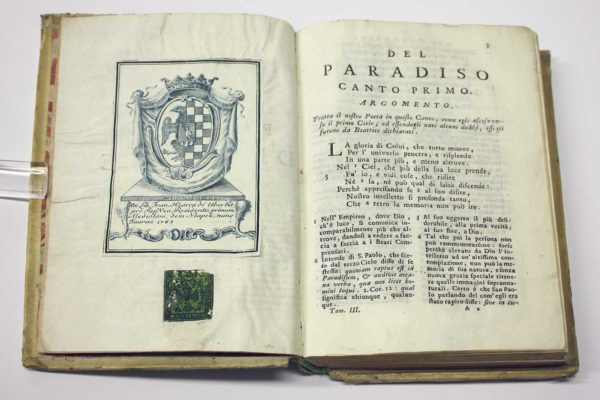 Dante Alighieri (1265-1321). Divina Commedia, Paradiso, 1304-1321. Ex-Libris Francesco Hiarca “Ex lib. Fran. Hiarca de Ubertis pro Rep. Ven. Residentis primum Mediolani dein Neapoli nunc Taurini 1765”. Collezione privata, Svizzera.