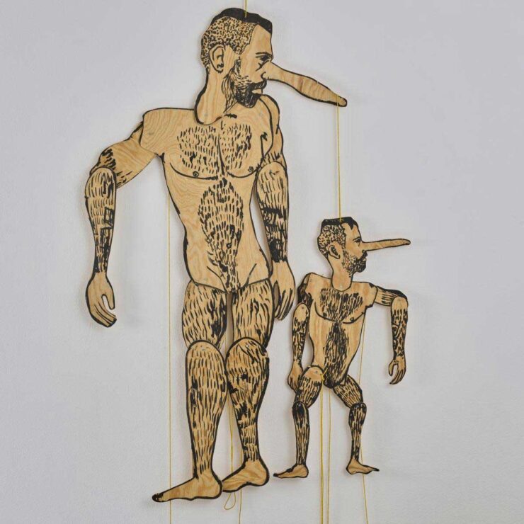 Installation with two ink drawings on two interlocking plywood panels, yellow string, both signed in Latin and Hebrew and dated in black marker on the reverse at the center, 119.0 x 74.0 x 3 cm.