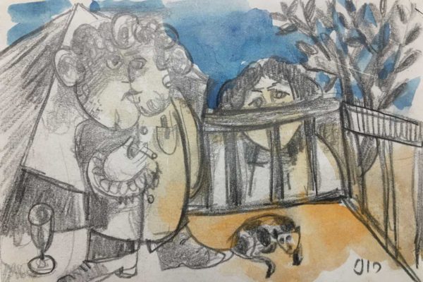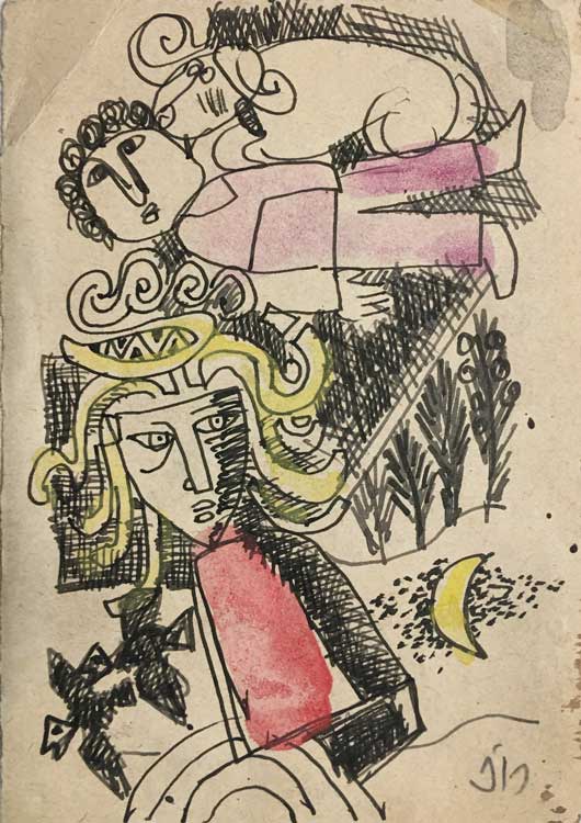 Ink and watercolor on paper, signed in Hebrew lower right, 12.4 x 8.8 cm.