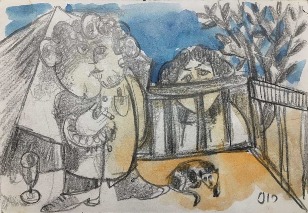 Graphite and watercolor on paper, signed in Hebrew lower right, 11.6 x 16.5 cm.