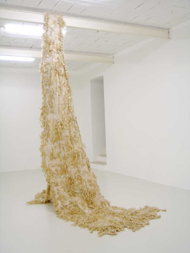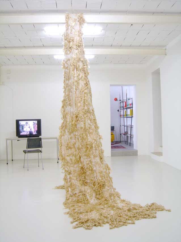 Più autoreferenziale è PRESENT TRACES del 1999, grande stoffa creata con capelli sintetici biondi dall’artista londinese Maurizio Anzeri (1969). Con questo lavoro egli cerca e trova l’ispirazione per affrontare il tema dell’identità corporea e spirituale. Con la stoffa si creano abiti e l’abito è la carapace che scegliamo per darci un’identità, per parlare di noi stessi come lo vogliamo noi. Il capello – biondo per ricordare Marilyn Monroe e il suo statuto di Sex Symbol – è anche la parte morta del nostro corpo, materiale chitinoso, ch’egli tesse con ossessivo piacere necrofilo e morboso per parlare di vita e di morte, di memoria e nostalgia della vita.